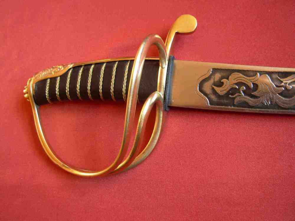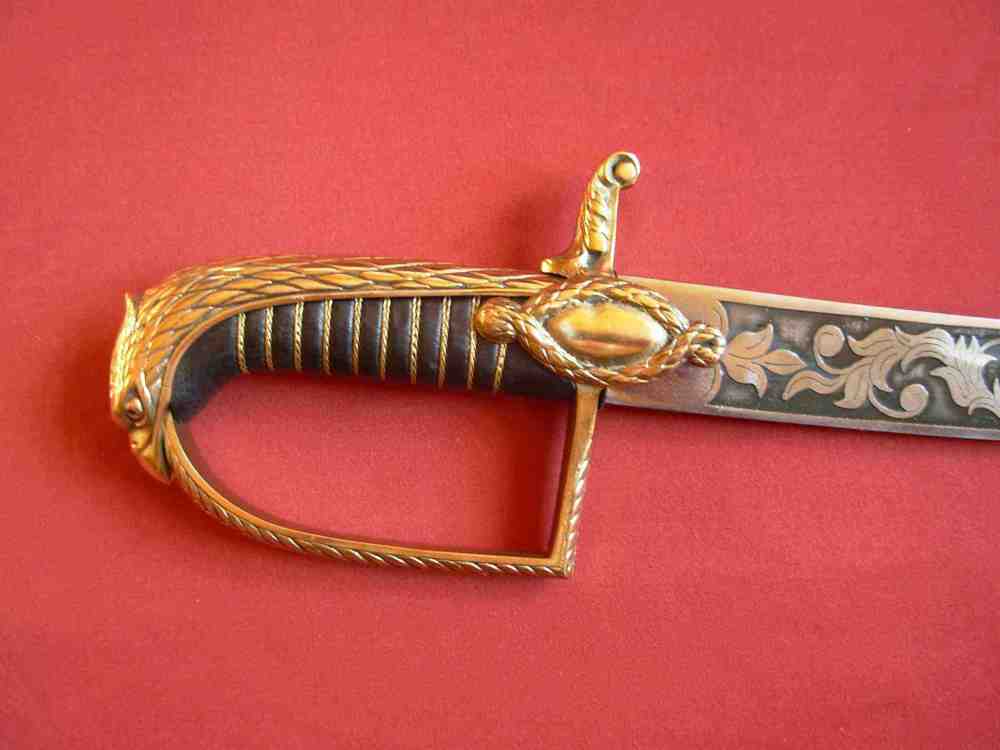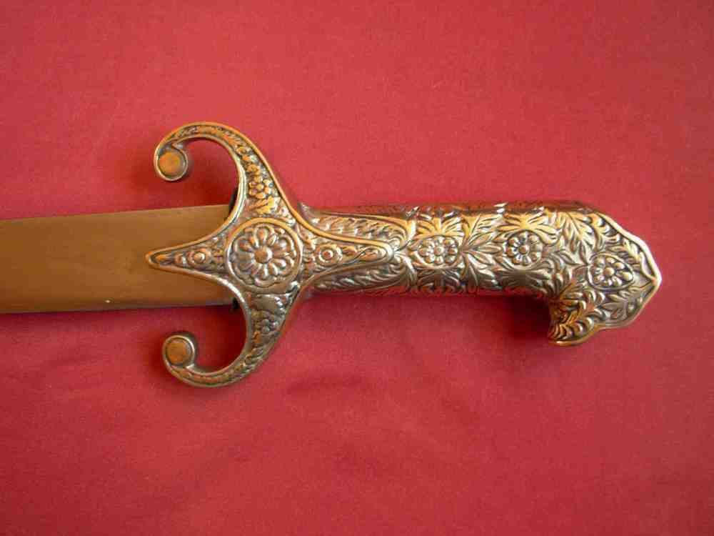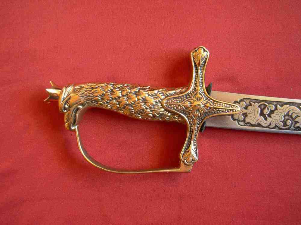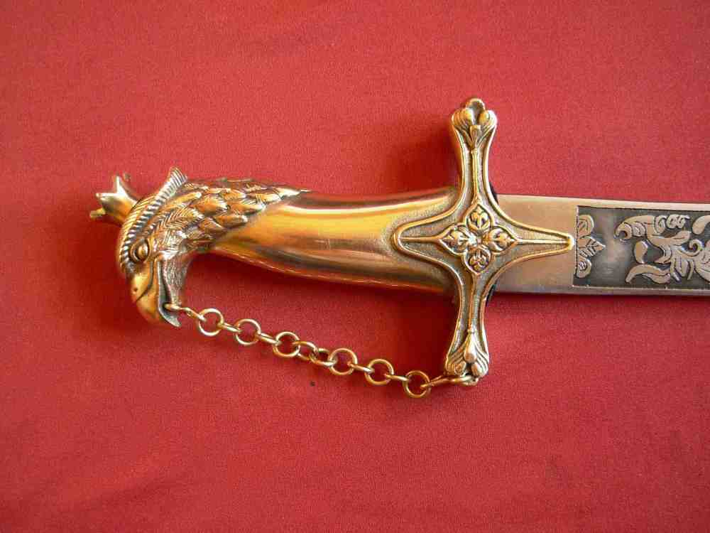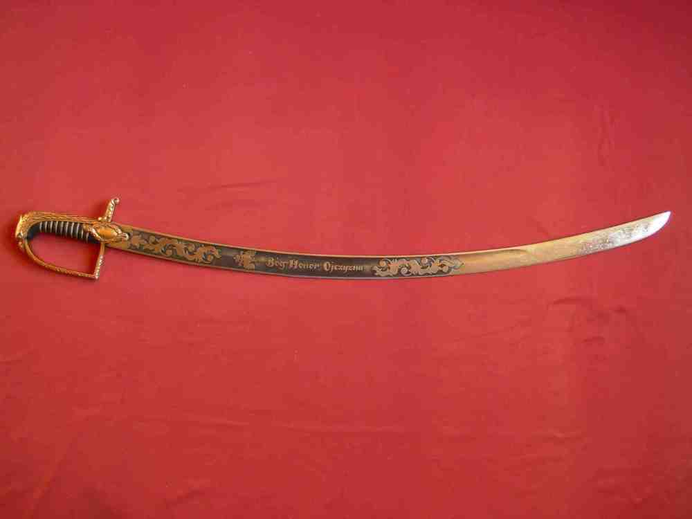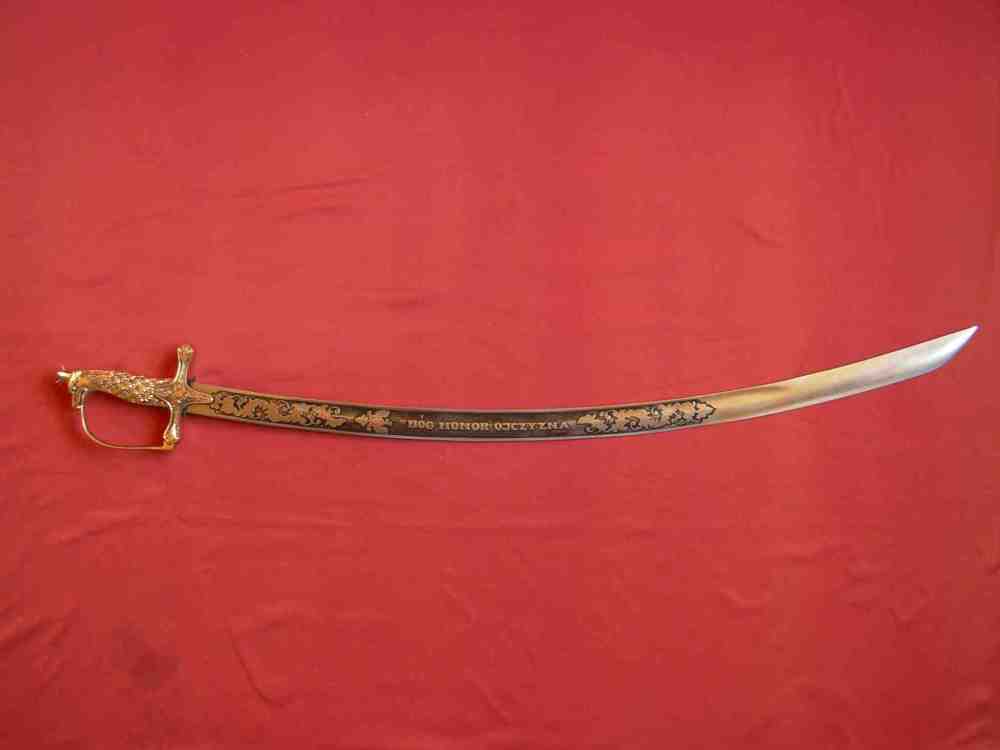 Der polnische Offiziers-Säbel mit Griff in Form des Kopfes des Adlers vom XX Jahrhundert. Der Griff aus gegossenem Messing bildet eine Gesamtheit. Der Kopf des Griffe ist in Form des Kopfes des Adlers mit Krone. Der Korb ist mit einem Ornament verziert. Die Schneide des Säbels ist aus Stahl ausgeführt, reich verziert.