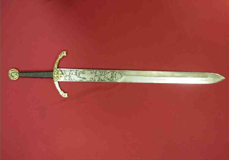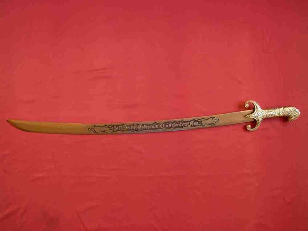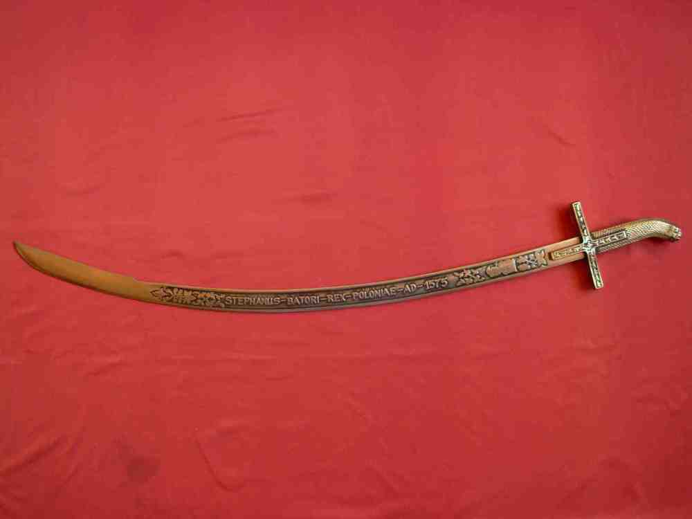 Der polnische Säbel "Batorówka" des ungarisch- polnischen Typs vom XVII Jahrhundert. Der Griff bildet eine Gesamtheit mit dem Messingkorb. Kreuzkorb mit langen geraden Schultern. Auf dem Griff und dem Korb befinden sich Pflanzenornament. Die Schneide des Säbels ist aus Stahl ausgeführt und mit Aufschrift "Stefan Batory der König des Polens, Anno Domini 1575" geschmückt. |